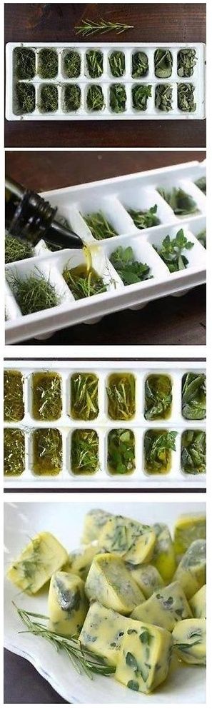 As ervas aromáticas frescas sobejantes podem ser congeladas frescas: basta colocá-las dentro das formas de gelo, cobrir com água ou azeite e colocar dentro do congelador.