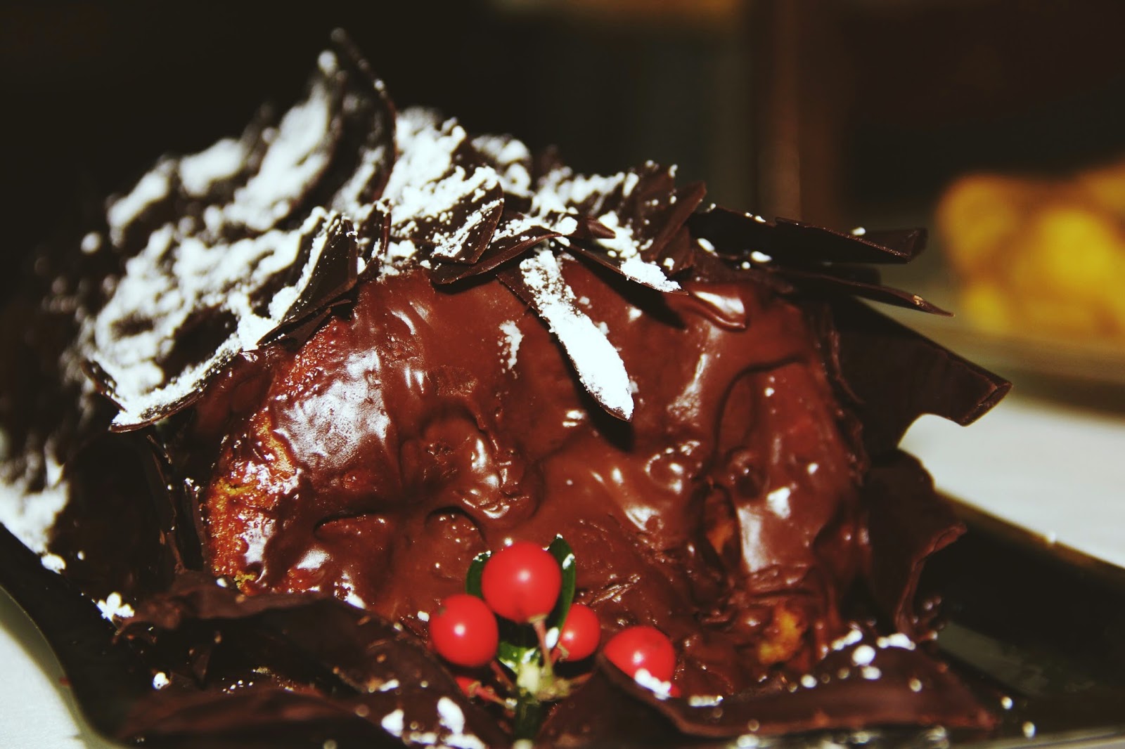 Por isso, o nosso tronco de Natal é apenas recheado com um pouco de chocolate e decorado com placas de chocolate.