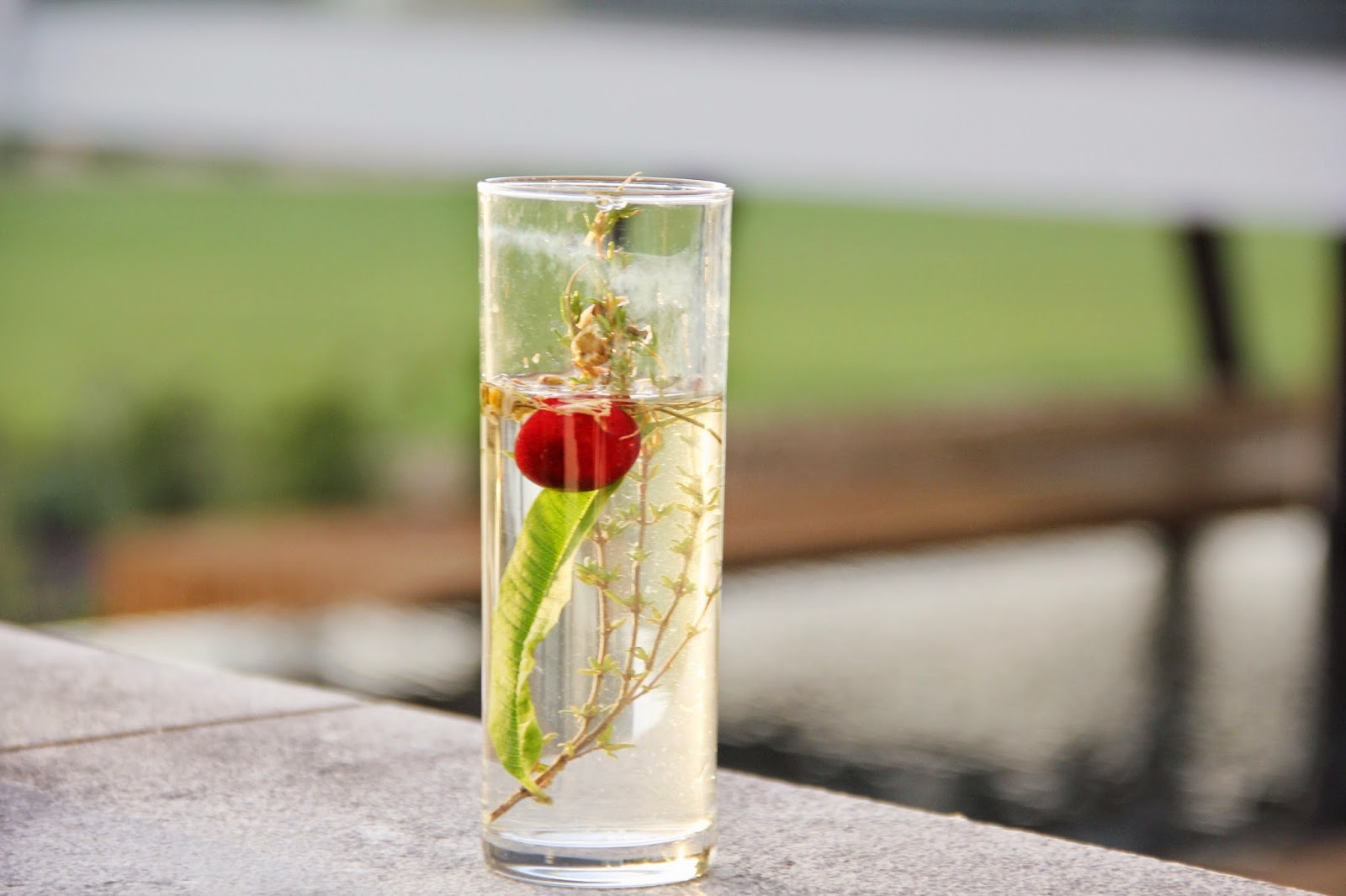 Adicionar as rodelas de laranja, a casca do limão, as cerejas, as ervas aromáticas frescas, a rodela do gengibre e a camomila.