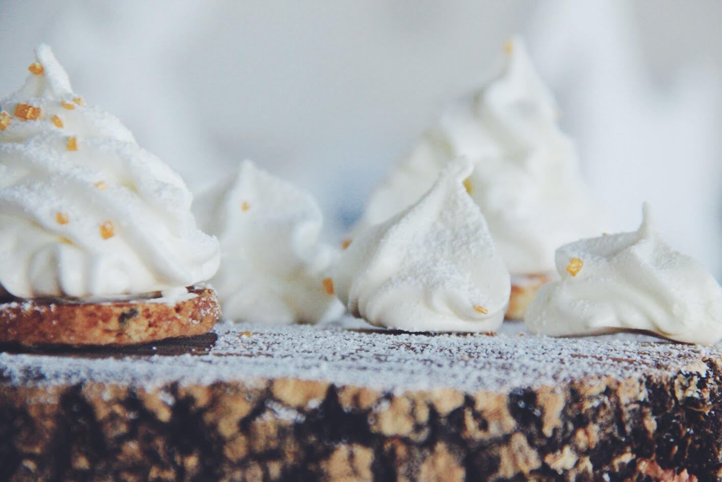 Pinheiros de Natal em suspiro numa base de bolacha de gengibre é a minha proposta para decorar a mesa de doces deste Natal.